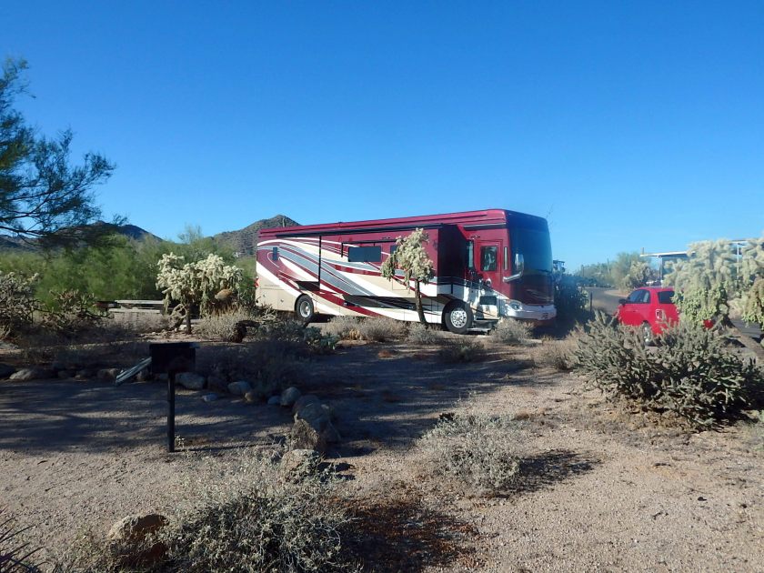 We took another step closer to So Cal today when we left Tucson in our rear-view monitor (LeuC does not have a rear view mirror since she does not have a rear window; instead she uses a camera to show what is behind her) and drove northwest to the Usery Mountains Regional Park, northeast of Mesa, Arizona. It was just a 2.5 hour drive which included a stop to pump in 57 gallons of diesel at the Pilot Triple J truck stop.